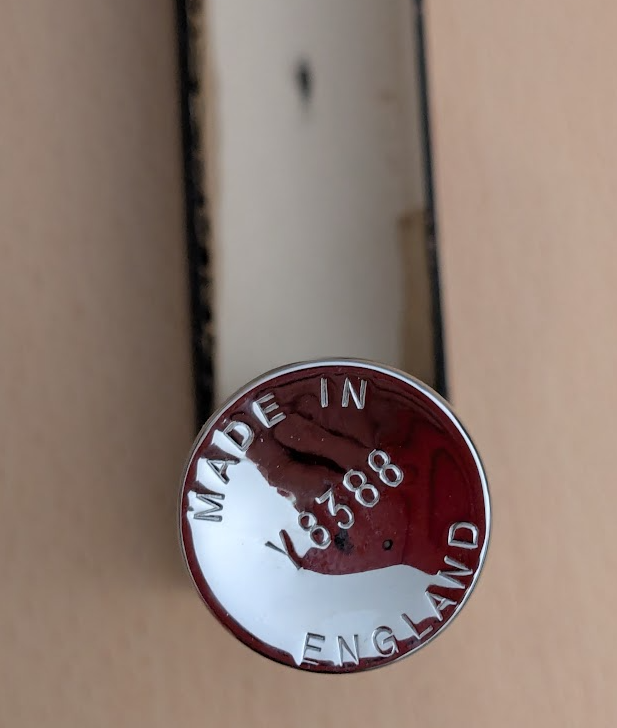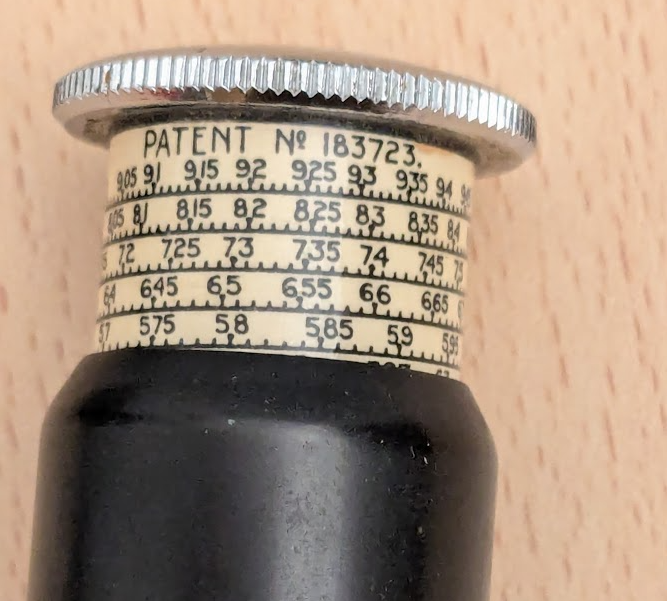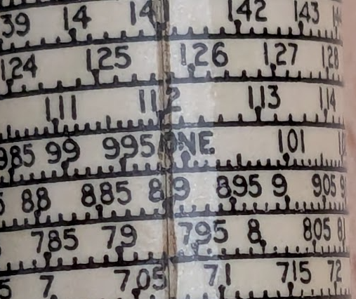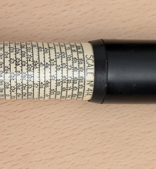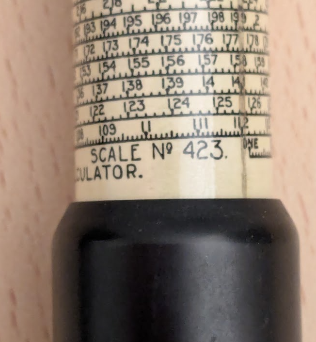 This Otis King calculator comprises a holder (gripped by hand) around which a 66 inch long logarithmic scale (labled No. 414) is wound. The movable cylinder carries two scales in series (labled No. 423) which are identical in all respects to Scale 414. The point at which these two scales meet half-way up the cylinder is denoted by yhe word ‘One’.