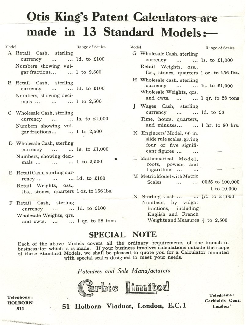 Invented by Otis King, the calculator was manufactured by Carbic Ltd from about 1922 to about 1972 and was available as different models each designed to meet specific arithmetic requirements.