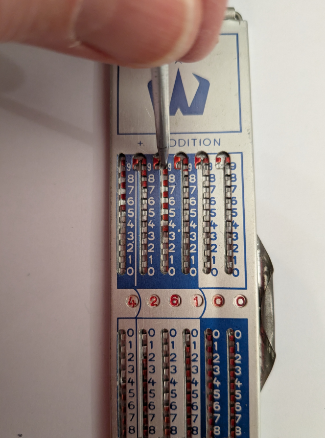 First a clearing bar is raised upwards to set the calculator to zero. Then using the stylus in the relevant numbered slots, the number 4261 is entered to show on the result row.