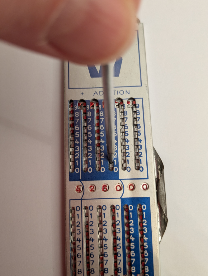 Now to add the ‘2’. The stylus is inserted in the hole opposite the ‘2’ in the first column and moved towards the answer window to form the final result ‘4353’.