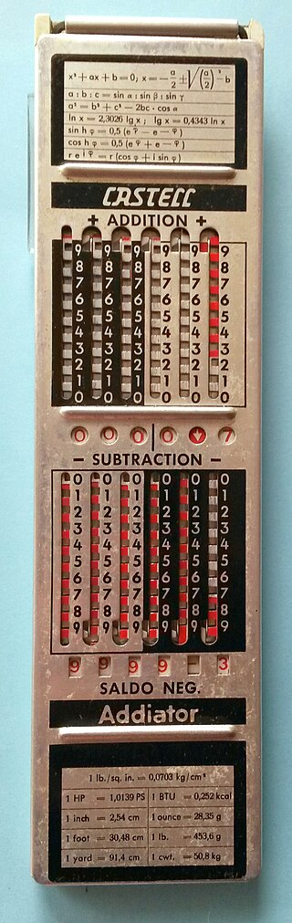 A slide calculator is a type of small, hand-held mechanical calculator, primarily for adding and subtracting. The example shown opposite features parallel toothed metal strips within a metal envelope and a side-mounted stylus to operate it.